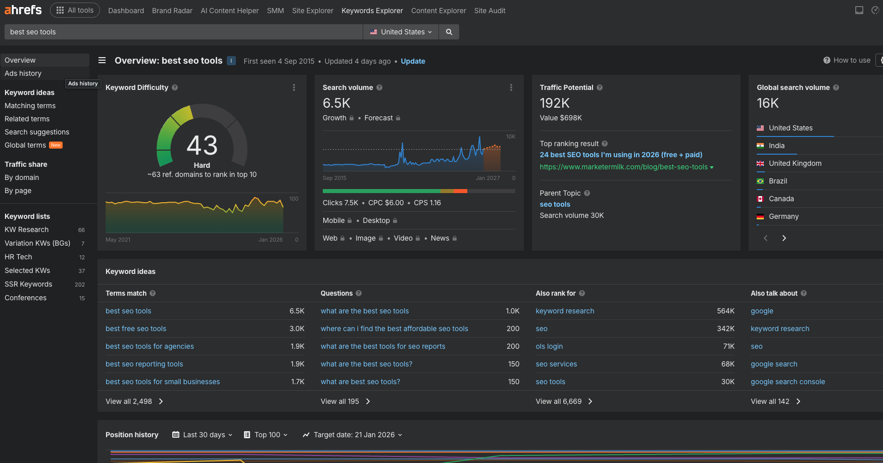 Ahrefs is one of the most trusted names in SEO software, and for good reason. It’s not trying to be everything for everyone — it’s built for people who want visibility into how search works, why their competitors are outranking them, and what they can do about it. That makes it especially valuable for small businesses with content programs already in motion or for founders who’ve been burned by SEO guesswork in the past.