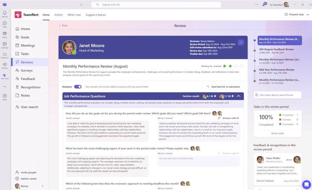 Teamflect is built for companies that use Microsoft Teams as their primary workspace. That unique design decision makes it an appealing solution for organizations looking to centralize performance workflows in one familiar environment.