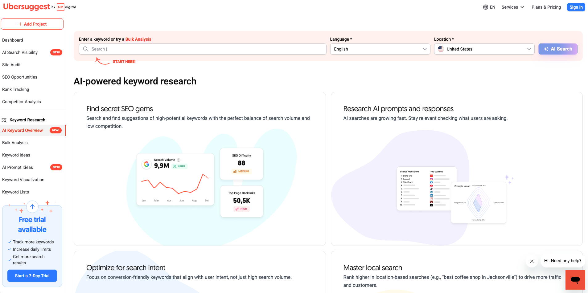 The free version and 7-day trial are good ways to test whether the simplicity and pricing fit your needs. Many users treat Ubersuggest as a gateway tool, one that helps them learn SEO fundamentals and gather basic insights before graduating to more advanced platforms.